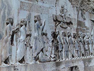 После входа в «Так-е Бостан» первый рельев посвящен Ардеширу II. Ардешир находится между Ахурамаздой и Митрой, его лицо обращено к Ахурамазде и принимает от него кольцо благодати левой рукой. Под ноги царя и Ахурамазды брошен на землю враг или «дьявол». За этим рельефом находится небольшая арка, на которой можно увидеть изображения Шапура II и его сына Шапура III. Над каждым из этих рельефов строкой, написанной сасанидским письмом Пехлеви, указано, что кто изображен на рельефе.